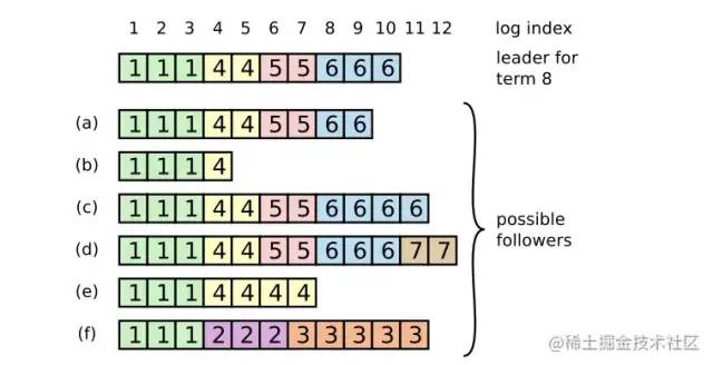 f节点也是,需要删除的日志很多。产生f节点的原因是因为它当选了term 2和 term 3的leader,但是数据都不曾同步给其他节点。