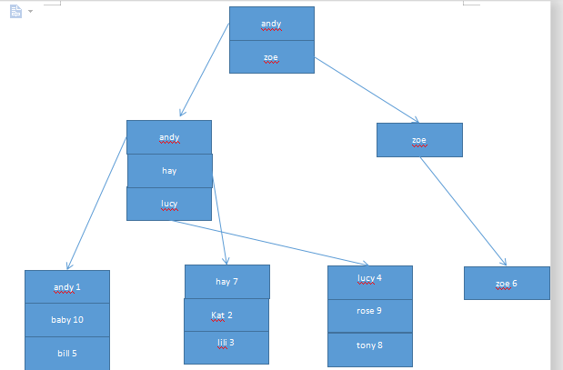 叶子节点内部使用 name 字段排序,叶子节点之间也是使用 name 字段排序。
