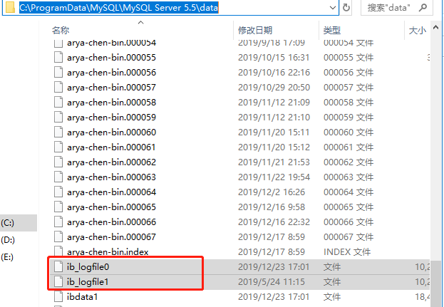 我们可以通过 show variables like 'datadir' 命令找到相关目录,底下有两个文件,分别是 ib_logfile0 和 ib_logfile1,如下图所示: