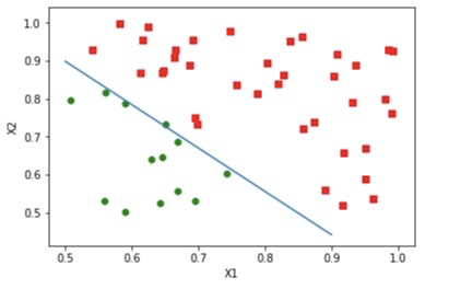 在机器学习当中,模型根据预测结果的不同分为两类,如果我们希望模型预测一个或者多个连续值 ,这类问题被称为是回归问题 。 像是常见的未来股票价格的估计、未来温度估计等等都算是回归问题。 还有一类呢是分类问题 ,模型的预测结果是一个离散值 ,也就是说只有固定的种类的结果。 常见的有垃圾邮件识别、网页图片鉴黄等等。 我们之前介绍的逻辑回归顾名思义是一个回归问题,今天的文章讲的呢是如何将这个回归模型转化成分类模型,这个由线性回归推导得到的分类模型称为逻辑回归。 逻辑回归 逻辑回归这个模型很神奇,虽然它的本质也是回归,但是它是一个分类模型,并且它的名字当中又包含”回归“两个字,未免让人觉得莫名其妙。 如果是初学者,觉得头晕是正常的,没关系,让我们一点点捋清楚。 让我们先回到线性回归,我们都知道,线性回归当中 。 我们通过W和b可以求出X对应的y,这里的y是一个连续值,是回归模型对吧。 但如果我们希望这个模型来做分类呢,应该怎么办? 很简单,我们需要人为地设置阈值对吧,比如我们规定y > 0最后的分类是1,y < 0最后的分类是0。 从表面上来看,这当然是可以的,但实际上这样操作会有很多问题。 最大的问题在于如果我们简单地设计一个阈值来做判断,那么会导致最后的y是一个分段函数,而分段函数不连续 ,使得我们没有办法对它求梯度,为了解决这个问题,我们得找到一个平滑的函数 使得既可以用来做分类,又可以解决梯度 的问题。 很快,信息学家们找到了这样一个函数,它就是Sigmoid函数 ,它的表达式是: 可以看到,sigmoid函数在x=0处取值0.5,在正无穷处极限是1,在负无穷处极限是0,并且函数连续,处处可导。 sigmoid的函数值的取值范围是0-1,非常适合用来反映一个事物发生的概率 。 我们认为 表示x发生的概率,那么x不发生的概率就是 。 我们把发生和不发生看成是两个类别,那么sigmoid函数就转化成了分类函数,如果 表示类别1,否则表示类别0. 到这里就很简单了,通过线性回归我们可以得到 。 也就是说我们在线性回归模型的外面套了一层sigmoid函数,我们通过计算出不同的y,从而获得不同的概率,最后得到不同的分类结果。 损失函数 下面的推导全程高能 ,我相信你们看完会三连的(在看、转发、关注)。 让我们开始吧,我们先来确定一下符号,为了区分,我们把训练样本当中的真实分类命名为 , 的矩阵写成 。 同样,单条样本写成 , 的矩阵写成 。 单条预测的结果写成 ,所有的预测结果的矩阵写成 。 对于单条样本来说,y有两个取值,可能是1,也可能是0,1和0代表两个不同的分类。 我们希望 的时候, 尽量大, 时, 尽量大,也就是 尽量小,因为它取值在0-1之间。 我们用一个式子来统一这两种情况: 我们代入一下, 时前项为1,表达式就只剩下后项,同理, 时,后项为1,只剩下前项。 所以这个式子就可以表示预测准确的概率,我们希望这个概率尽量大。 显然, ,所以我们可以对它求对数,因为log函数是单调的。 所以 取最值时的取值,就是 取最值的取值。 我们期望这个值最大,也就是期望它的相反数最小,我们令 ,这样就得到了它的损失函数: 如果知道交叉熵这个概念的同学,会发现这个损失函数的表达式其实就是交叉熵 。 交叉熵是用来衡量两个概率分布之间的”距离 “,交叉熵越小说明两个概率分布越接近,所以经常被用来当做分类模型的损失函数 。 关于交叉熵的概念我们这里不多赘述,会在之后文章当中详细介绍。 我们随手推导的损失函数刚好就是交叉熵,这并不是巧合,其实底层是有一套信息论 的数学逻辑支撑的,我们不多做延伸,感兴趣的同学可以了解一下。 硬核推导 这个函数看起来非常复杂,要对它直接求偏导过于硬核 (危),如果是许久不碰高数的同学直接肝不亚于硬抗苇名一心。 为了简化难度,我们先来做一些准备工作。 首先,我们先来看下 函数,它本身的形式很复杂,我们先把它的导数搞定。 代码实战 不过巧妇难为无米之炊,在我们撸模型之前,我们先试着造一批数据。 我们选择生活中一个很简单的场景——考试。 假设每个学生需要参加两门考试,两门考试的成绩相加得到最终成绩,我们有一批学生是否合格的数据。 希望设计一个逻辑回归模型,帮助我们直接计算学生是否合格。 为了防止sigmoid函数产生偏差,我们把每门课的成绩缩放到(0, 1)的区间内。 两门课成绩相加超过140分就认为总体及格。 import numpy as npdef load_data () : X1 = np.random.rand(50 , 1 )/2 + 0.5 X2 = np.random.rand(50 , 1 )/2 + 0.5 y = X1 + X2 Y = y > 1.4 Y = Y + 0 x = np.c_[np.ones(len(Y)), X1, X2] return x, Y这样得到的训练数据有两个特征,分别是学生两门课的成绩,还有一个偏移量 1,用来记录常数的偏移量。 接着,根据上文当中的公式,我们不难(真的不难)实现sigmoid以及梯度下降的函数。 def sigmoid (x) : return 1.0 /(1 +np.exp(-x)) def gradAscent (data, classLabels) : X = np.mat(data) Y = np.mat(classLabels) m, n = np.shape(dataMat) # 学习率 alpha = 0.01 iterations = 10000 wei = np.ones((n, 1 )) for i in range(iterations): y_hat = sigmoid(X * wei) error = Y - y_hat wei = wei + alpha * X.transpose()*error return wei这段函数实现的是批量梯度下降,对Numpy熟悉的同学可以看得出来,这就是在直接套公式。 import matplotlib.pyplot as pltdef plotPic () : dataMat, labelMat = load_data() #获取梯度 weis = gradAscent(dataMat, labelMat).getA() n = np.shape(dataMat)[0 ] xc1 = [] yc1 = [] xc