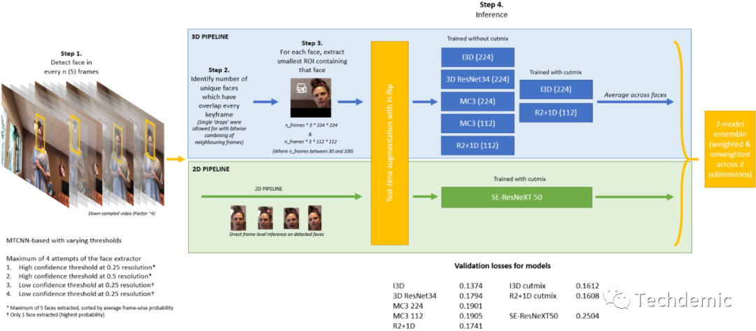 第八名的方案,则是一个纯Video解决方案,他们用了3D CNN(I3D, 3D ResNet等)融合了一个2DCNN模型,一共8个模型。