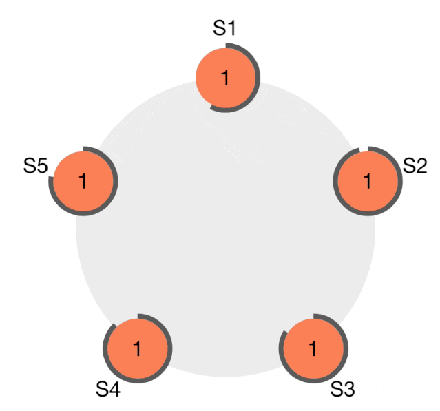 选举过程如下面的动图 2 所示,S1 ~ S5 在不同随机大小的 election timer 时间中,S1 率先结束发起选举,并成为 Leader. 并在随后不断的发起 heartbeat 刷新其它节点的计时器.