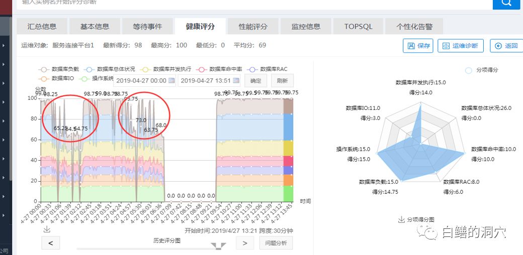 首先我们来看健康模型,从时序上看,早上6点36分后到9:54这段时间数据是缺失的,这段时间可能就是本次故障的系统宕机时段,或者该时段数据库已经出现了严重的问题,监控探针都无法登录数据库采集指标了。宕机时间从6:35分之后,从监控管理的告警数据可以看到7:18左右数据库发生了宕机,在ALERT LOG中也确认了这个信息。系统恢复的时间是9:51-9:54之间。