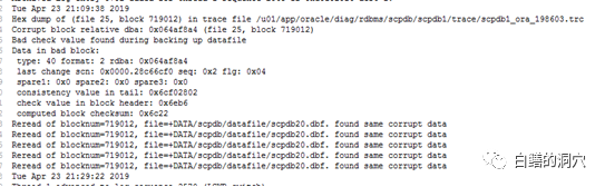通过IO分析工具检查,发现系统IO存在较为严重的问题,问题可能来自于后端存储。于是我们要求存储厂商检查SAN网络与后端存储的情况。存储厂商坚称存储没问题。于是我们又扩大了排查范围,在前一天晚上21点左右的时候发现了一个日志告警的信息,通过ALERT LOG确认,是在数据库做全备的时候出现了一个报错: