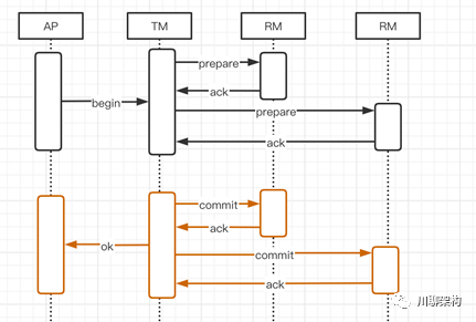 TM:对RM发送Prepare指令,等待RM的回执(ACK)