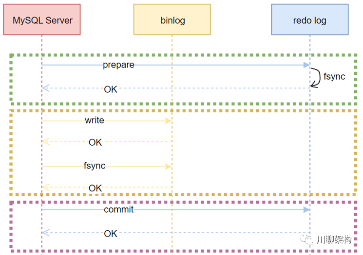 MySQL的二阶段,Server 先发给binLog 进行write + fsync进行合并操作,然后在通知redo log进行Commit。