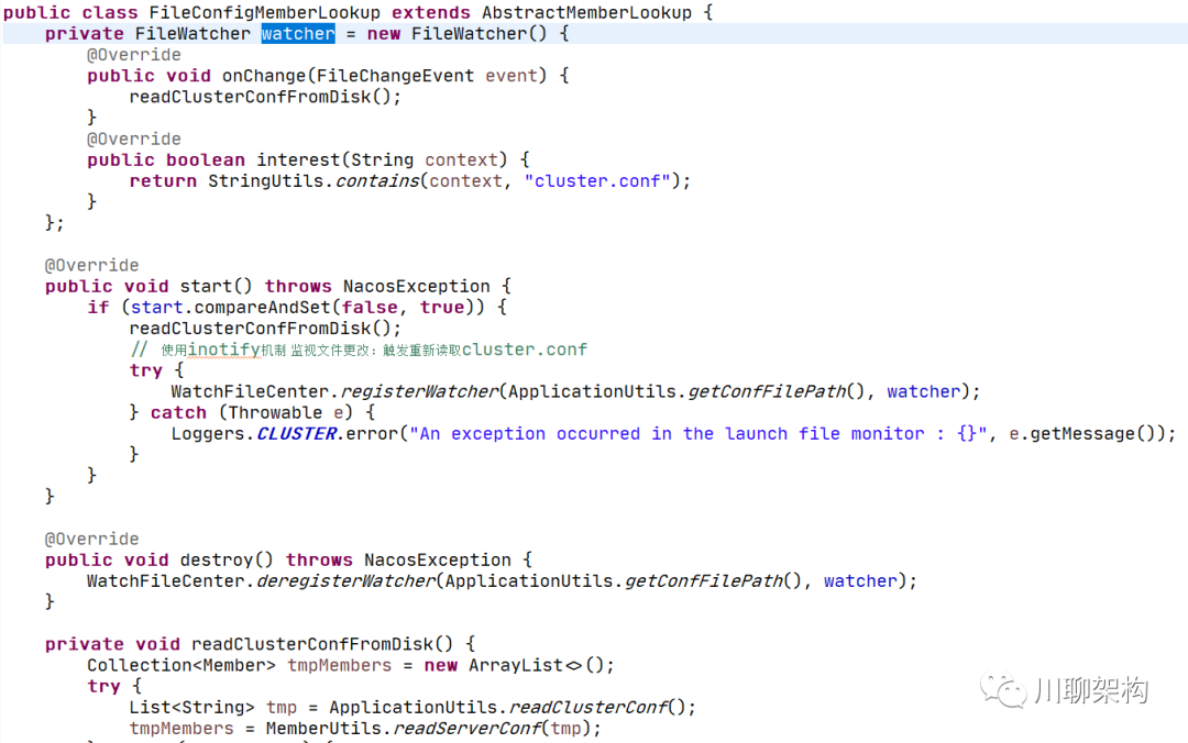 文件模式:FileConfigMemberLookup -- 利用监控cluster.conf文件的变动实现节点的管理。核心代码如下: