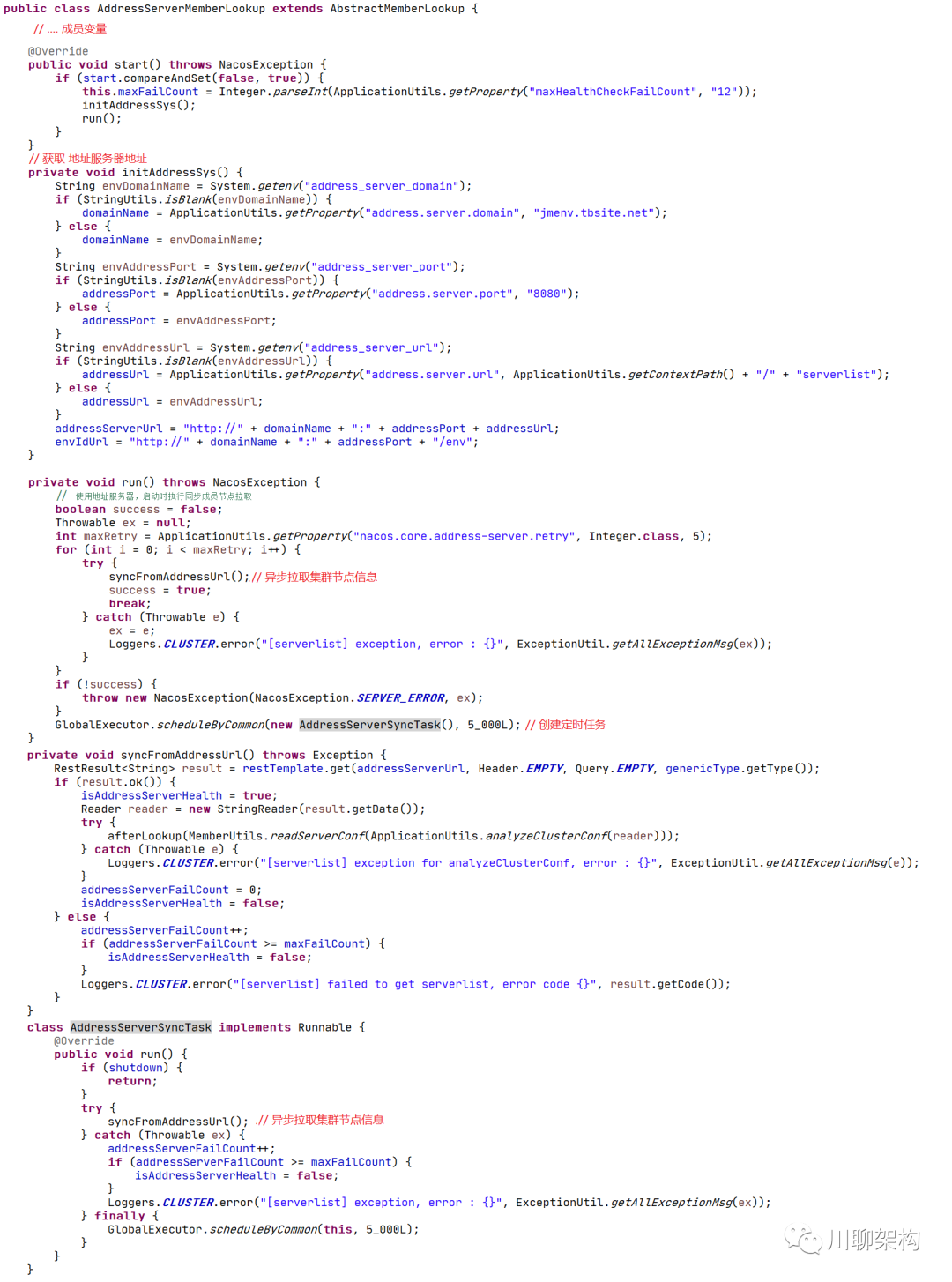 服务器模式:AddressServerMemberLookup – 使用地址服务器存储节点信息,服务端节点定时拉取信息进行管理