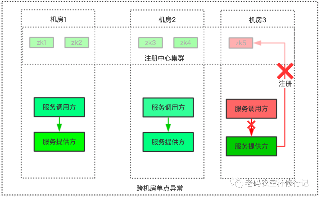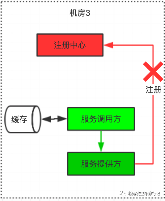 机房3 的服务调用方 无法发现服务提供方,导致服务不可用