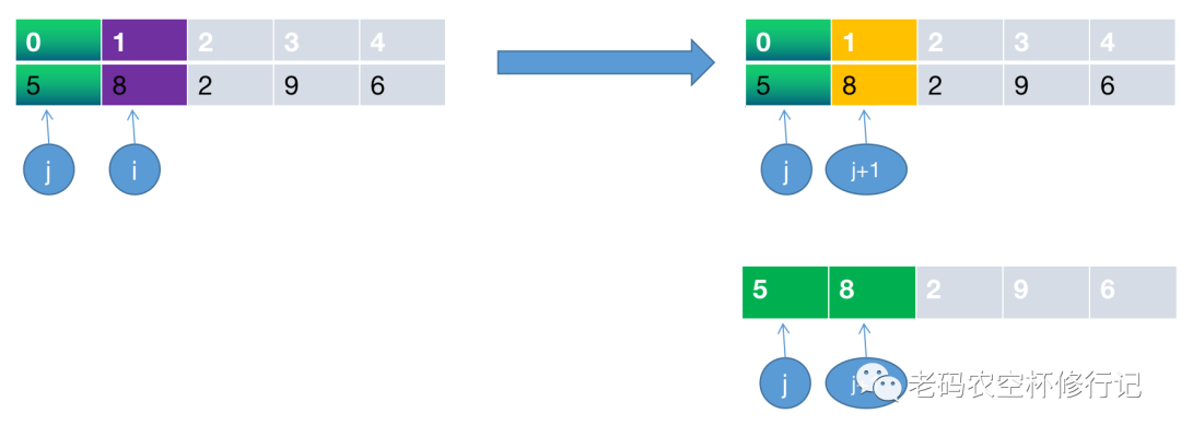 接第二张牌:i=1, 牌面 8;j ∈ [0,0],第二张牌从右至左比较,前面只有一张牌,牌面 8 > 5, 无需交换,直接插入最右边
