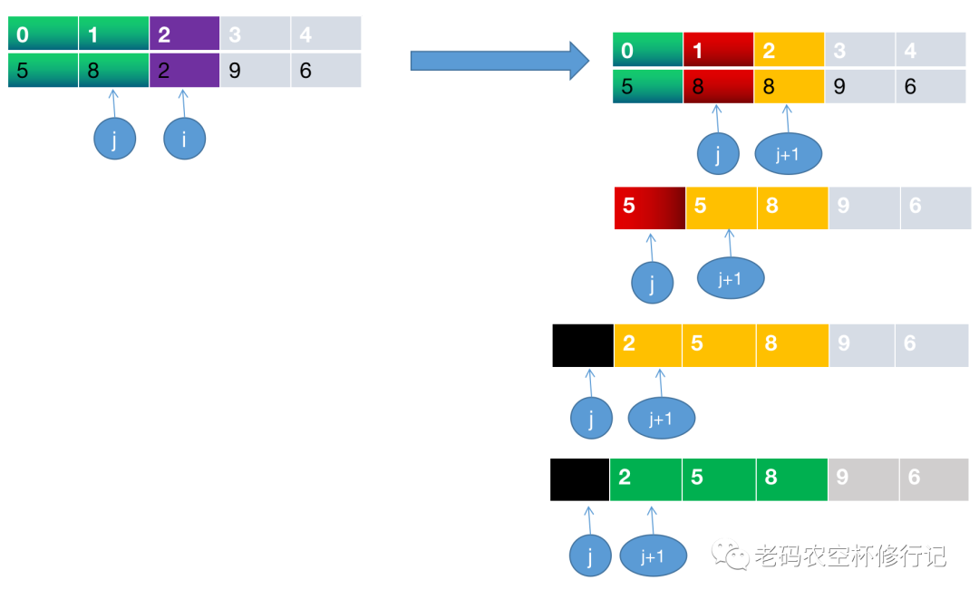 接第三张牌:i=2,牌面为 2;j ∈ [1,0],手中的牌面大于刚接到的牌面,则先把手中的牌面向右边移动,空出一个插入的位置,以此类推