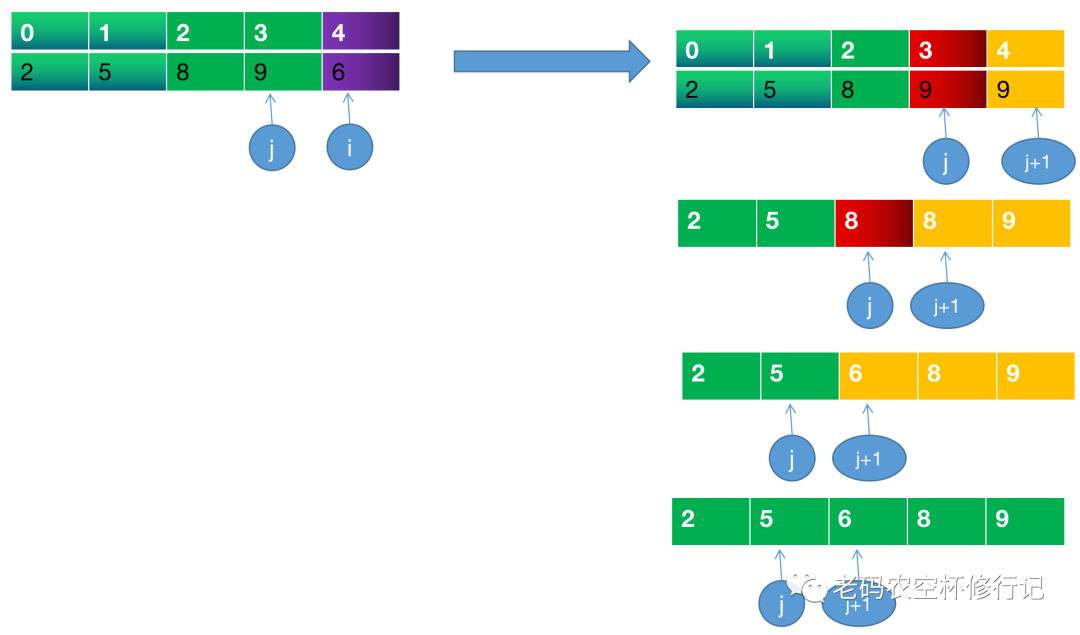 接第四张牌:i=3,牌面为 9;j ∈ [2,0],新接的牌面大于手中最右边的牌面 8,所以直接插入到最右边