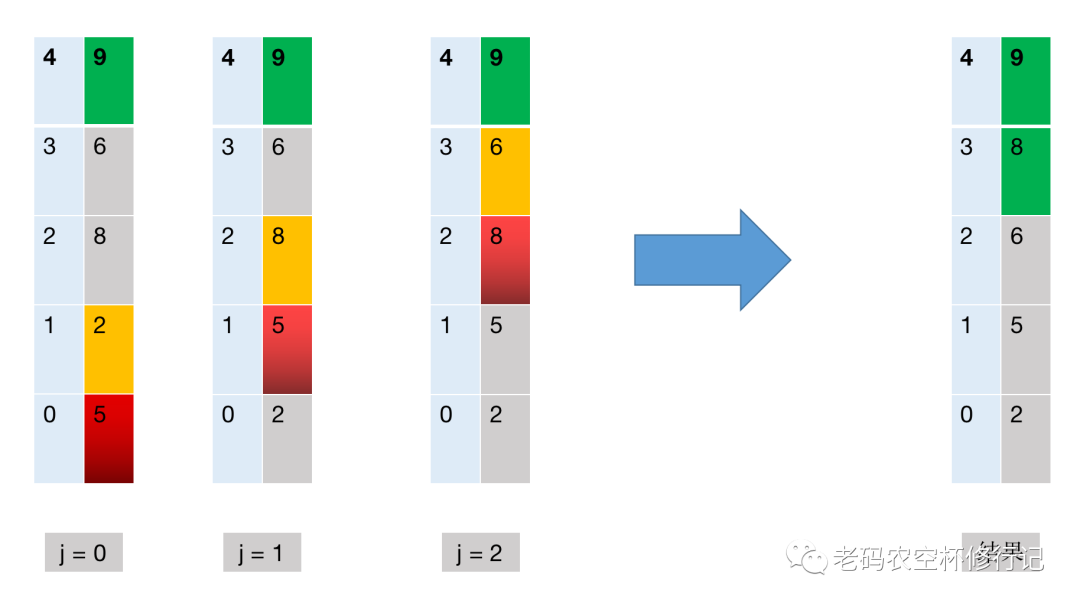 第三轮冒泡:i=2,j ∈ [0,2),绿色部分已排好序,不参与冒泡,从底部 2 开始按照第一轮的逻辑向上冒