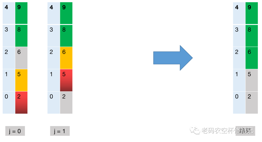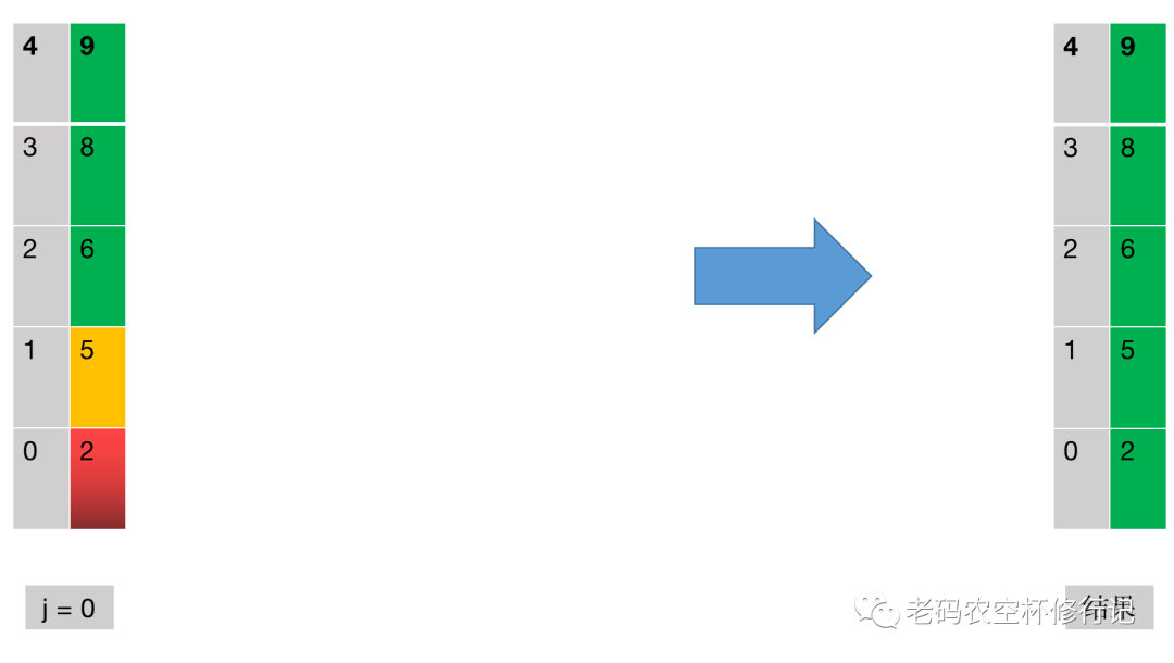 第四轮冒泡:i=3,j ∈ [0,1),绿色部分已排好序,不参与冒泡,从底部 2 开始按照第一轮的逻辑向上冒