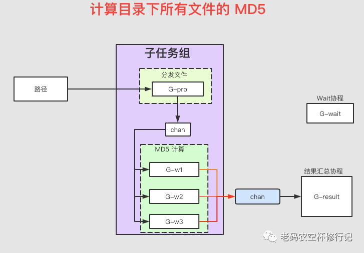 G-pro:负责目录遍历协程,分发文件路径到 chan G-w*:负责消费 G-pro 结果的协程,并计算 MD5,并将结果发送到结果 chan