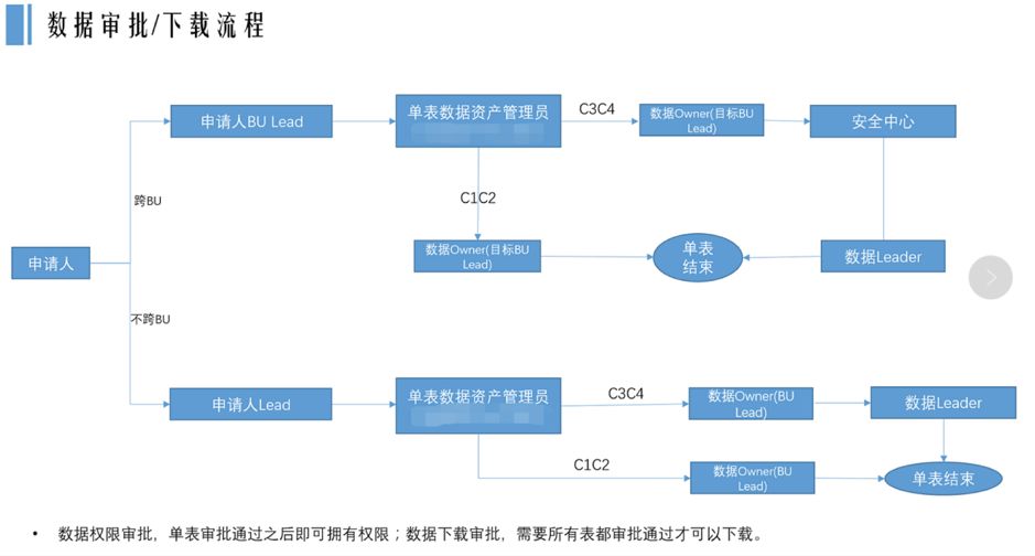 1. 安全性:要确保用户信息安全性,如果用户数据发生泄漏会是重大的安全事故。尽量脱敏或加密用户敏感信息,数据分析师使用数据必须有合规的流程审批和权限控制。审批流程需要依据数据是否敏感,是否跨 BU 进行不同的审批策略。确保所有的数据操作都符合安全需要并记录审计。