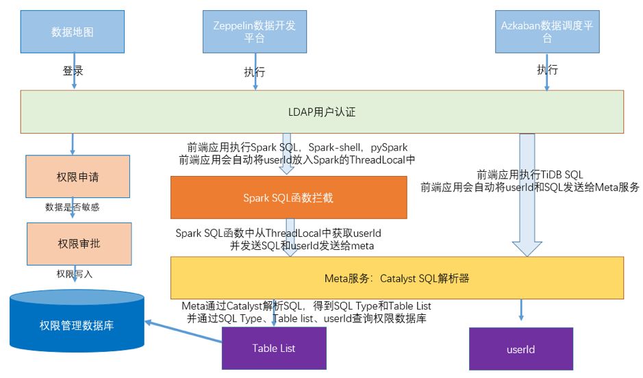 权限管理系统会将用户和 SQL 发送给权限认证系统。在权限认证系统中会通过 SQL 解析拿到 SQL 中的 Table 和 Column,并校验此用户是否有对应的权限,如果没有权限则提示用户申请权限,验证通过之后则继续执行 SQL。贝壳金服在 Spark Catalyst 之上进行二次开发,实现了 Spark SQL 和 TiDB SQL 的解析。上述过程具体流程如图: