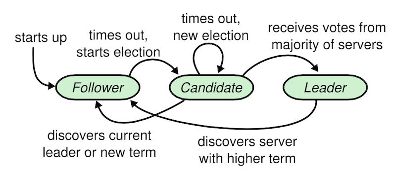 服务器节点有三种状态:领导者、跟随者和候选者。正常情况下,系统中只有一个领导者,其他的节点全部都是跟随者,领导者处理全部客户端请求,跟随者不会主动发送任何请求,只是简单的响应来自领导者或者候选者的请求。如果跟随者接收不到消息(选举超时),那么他就会变成候选者并发起一次选举。获得集群中大多数选票的候选者将成为领导者,领导者一直都会是领导者直到自己宕机了。Raft 算法把时间分割成任意长度的任期(term),每一段任期从一次选举开始,一个或者多个候选者尝试成为领导者。如果一个候选者赢得选举,然后他就在这个的任期内充当领导者。要开始一次选举过程,跟随者先要增加自己的当前任期号并且转换到候选者状态,然后他会并行的向集群中的其他服务器节点发送请求投票的 RPCs 来给自己投票,候选者会继续保持着当前状态直到以下三件事情之一发生:(a) 他赢得了这次的选举,(b) 其他服务器成为领导者,(c) 没有任何一个候选者赢得选举。当一个候选者获得了集群大多数节点针对同一个任期号的选票,那么他就赢得了选举并成为领导者。然后他会向其他的服务器发送心跳消息来建立自己的权威并且阻止新的领导人的产生。下图为三种角色的转换状态机。