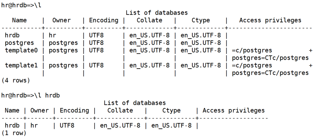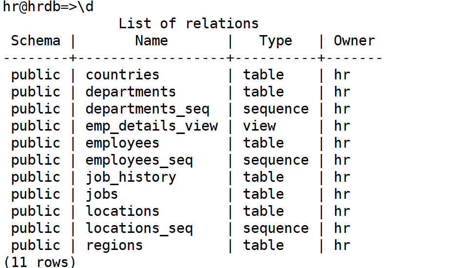 [sdedu@postgres:/home/postgres]$psql -U hr -d hrdb
