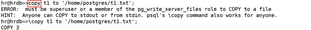 hrdb=> copy t1 to stdout; --该用户不具有 superuser用户的权限,但是copy后跟stdout便可以执行它
