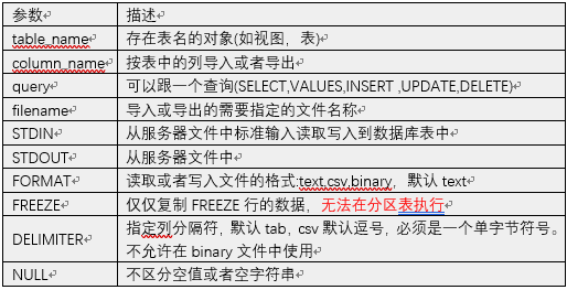 copy 或 \copy 的用法基本上相似,这里列举的参数为SQL 命令中的 copy 参数,这些参数也可以在元命令\copy 中使用。