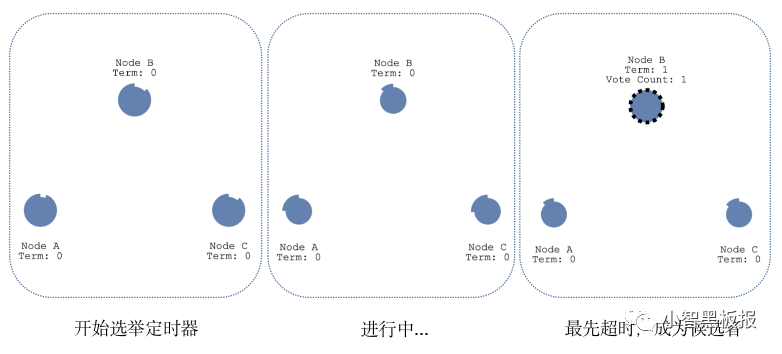 初始时所有节点都是群众,并且各自的选举定时器开始计时。