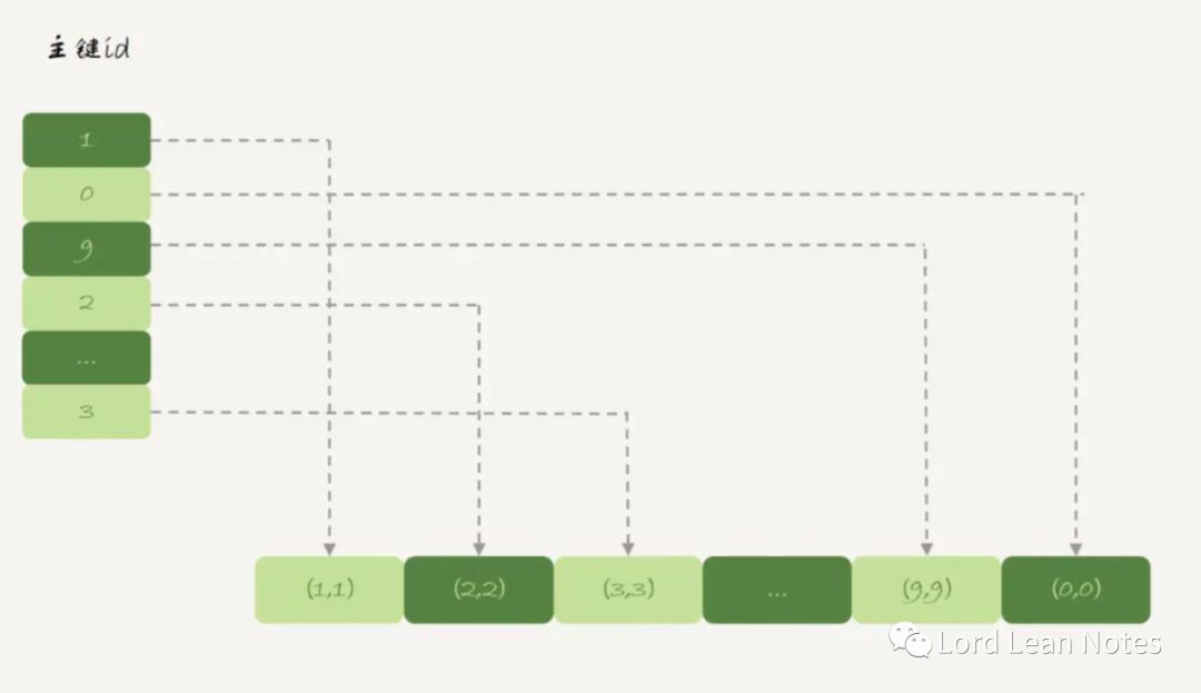 我们可以看到其索引和数据是分开存储的,数据部分是以数组的方式来进行存储的,而主键id是hash索引,每个主键id中记录着对应数据的位置,并且主键id是无序的。当我们select *时,会顺序扫描数据数组,所以0是最后一个。