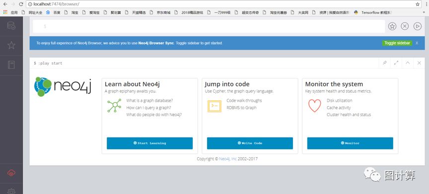 Neo4j服务器具有一个集成的浏览器,在一个运行的服务器实例上访问 “http://localhost:7474/”,打开浏览器,显示启动页面