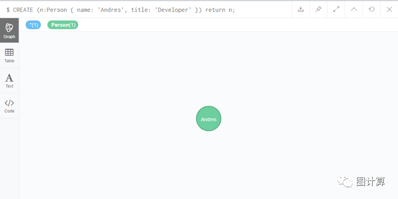 在第一个节点创建之后,在Graph模式下,能够看到创建的图形,继续编写Cypher脚本,创建其他节点和关系