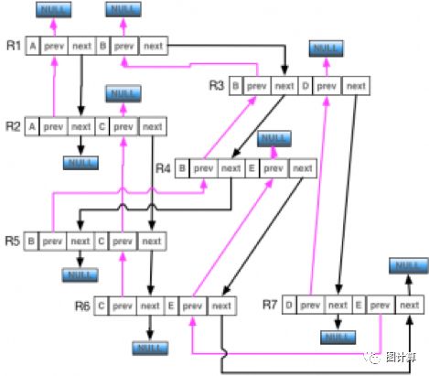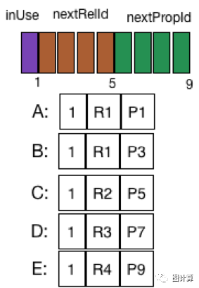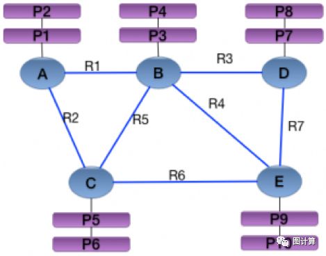在这个例子中,A~E表示Node 的编号,R1~R7 表示 Relationship