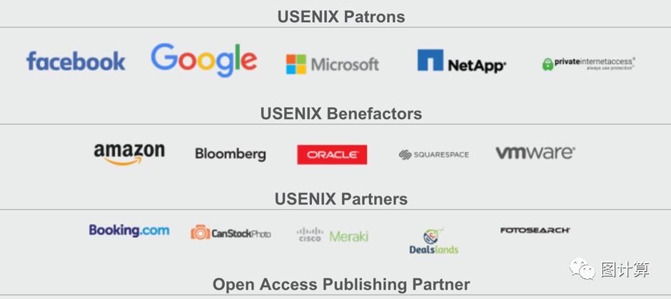 其中OSDI虽然比较年轻,但是其发起者USENIX[3]则是比较老牌的组织。自1975年以来,USENIX先进计算系统协会将工作于计算领域前沿的工程师,系统管理员,科学家和技术人员聚集在一起。 USENIX会议已成为展示和讨论计算系统各方面发展最先进信息的重要会议场所。举办过很多我们熟知的优秀会议,如FAST,ATC,NSDI,Middleware,IMC,LISA,Security等[4],其赞助商更是被我们所熟知,如下图所示: