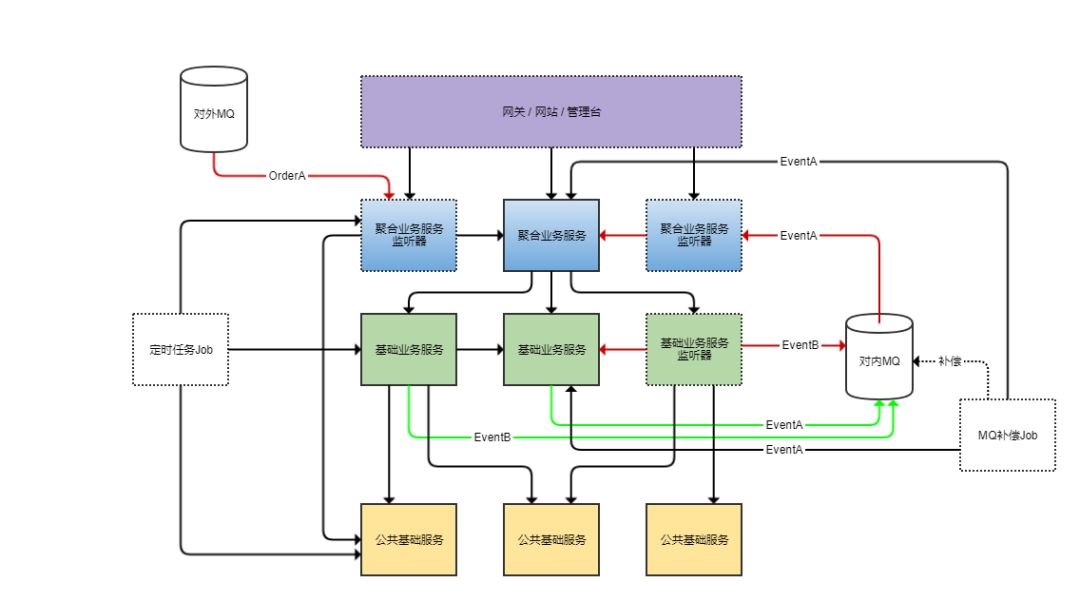图上画了虚线框的都代表这个模块或项目是不包含太多业务逻辑的,纯粹是一层皮(会调用服务但是不会触碰数据库)。黑色线的箭头代表依赖关系,绿色和红色箭头分别是MQ的发送和订阅消息流的方向。具体在后文都会进一步详细说明。