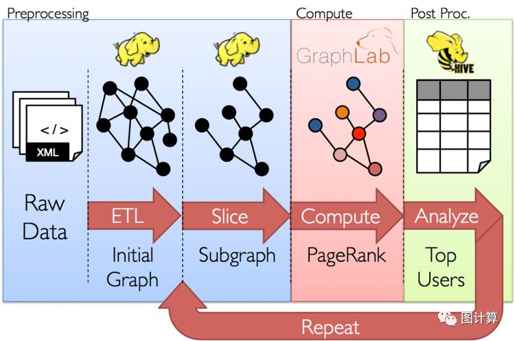 在性能方面讲,分布式数据计算系统的处理速度比不上分布式图系统,分布式图系统在执行复杂的图算法时,比GraphX这类的分布式数据计算要快很多,但是有利必有弊,由于分布式图系统是针对像PageRank这样的迭代算法进行优化的,因此它更适合图的处理,可是在典型的图处理流水线中,它并不很好的处理所有操作,例如,构造图、修改其结构,或者跨越多个图进行计算。更准确的说,分布式图系统提供的更窄的计算视图无法处理那些构建和转换图结构以及跨越多个图的需求。分布式图系统中无法提供的这些操作需要数据在图本体之上移动并且需要一个图层面而不是单独的顶点或边层面的计算视图。例如,我们可能想将我们的分析限制在几个子图上,然后比较结果,这种处理不仅需要改变图结构,还需要跨越多个图计算。GrpahX中的图处理流水线。如图2
