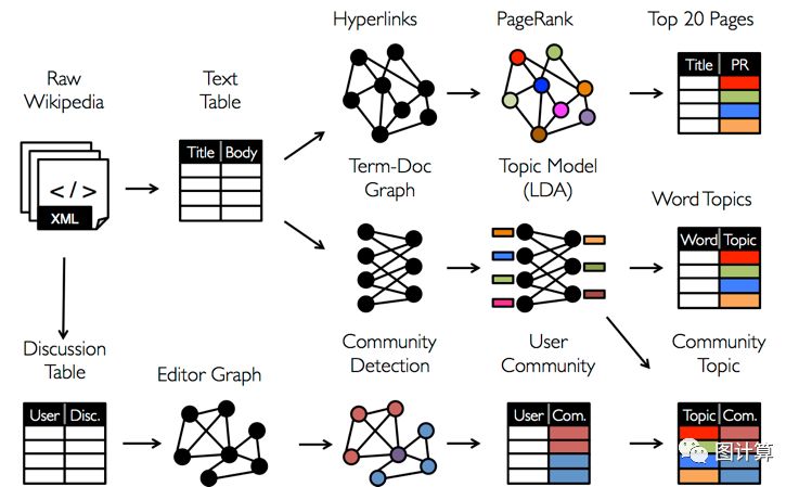 这个处理过程是,先获得元数据,然后根据元数据经过ETL(Extract-Transform-Load)即抽取、转换、加载三个步骤来初始化图,再利用图分割算法获得子图,在子图的基础上,对其进行下一步的目标操作,图例中采取的是PageRank算法,执行完计算操作后,我们对结算结果进行查看分析,获得排名靠前的数据信息。我们如何处理数据取决于我们的目标,有时同一原始数据可能会处理成许多不同表和图的视图,并且图和表之间经常需要能够相互移动。如图3