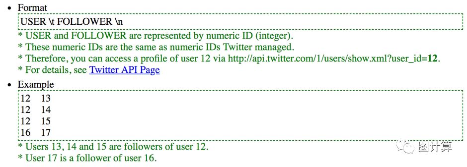 由于自然图边的数量远远大于顶点数量,并且每条边至少是由两个顶点编号标识,所以边的存储是难点。当边的数量较少时可以用文本文件存储,每一行标识一条边,如下图twitter-2010[2]的格式,它有61,578,415个顶点和1,468,365,182条边,占用24.4GB的存储空间。