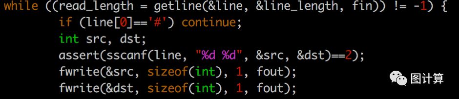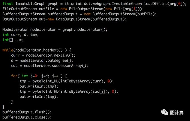 为了压缩存储空间和提高图计算系统读取数据的效率,常使用二进制格式存储边集。如果顶点的数量小于232,所以可以用4字节的int类型表示所有顶点。这样能大大节约存储空间,例如一个顶点编号是12345678,文本格式占8字节,而用二进制格式只占4字节,转换成二进制的twitter-2010边集文件仅11GB。同理更多的顶点(大于232)数量可采用8字节的long类型表示所有顶点。而文本格式和二进制格式间的相互转换可参考下面两个代码片段。