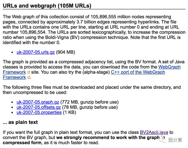 另外,web图的边数量可达到几百个billion甚至trillion级别,使用文本格式或者二进制格式依然会占用上百GB的空间,使用或传播都极其不方便,于是根据图的特性,压缩成graph格式的数据,例如uk-2007-05[3][4]图数据集。在[4]中指出uk-2007-05有105,896,555个顶点代表不同的web页面的URL,相互的超链接关系多达3.7billion条边。顶点是文本格式数据,每行一个URL,编号从0至105,896,554,大概904MB。