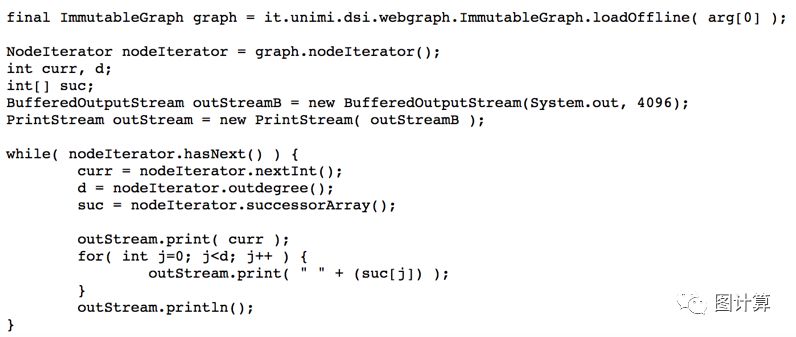 边则是提供BV格式[5] 压缩的邻接列表文件,由uk-2007-05.graph,uk-2007-05.offsets和uk-2007-05.properties三个核心文件组成。数据的每个nodeIterator由三部分组成<源顶点编号,出度值,目的顶点编号数组>,因此将它转换为二进制或者文本格式使用WebGraph库即可完成。