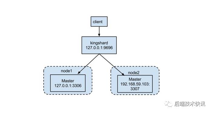 由于作者的只有两台MySQL,所以搭建了两个节点,这两个节点都只有一台Master 角色的MySQL数据库,具体的拓扑图如下所示: