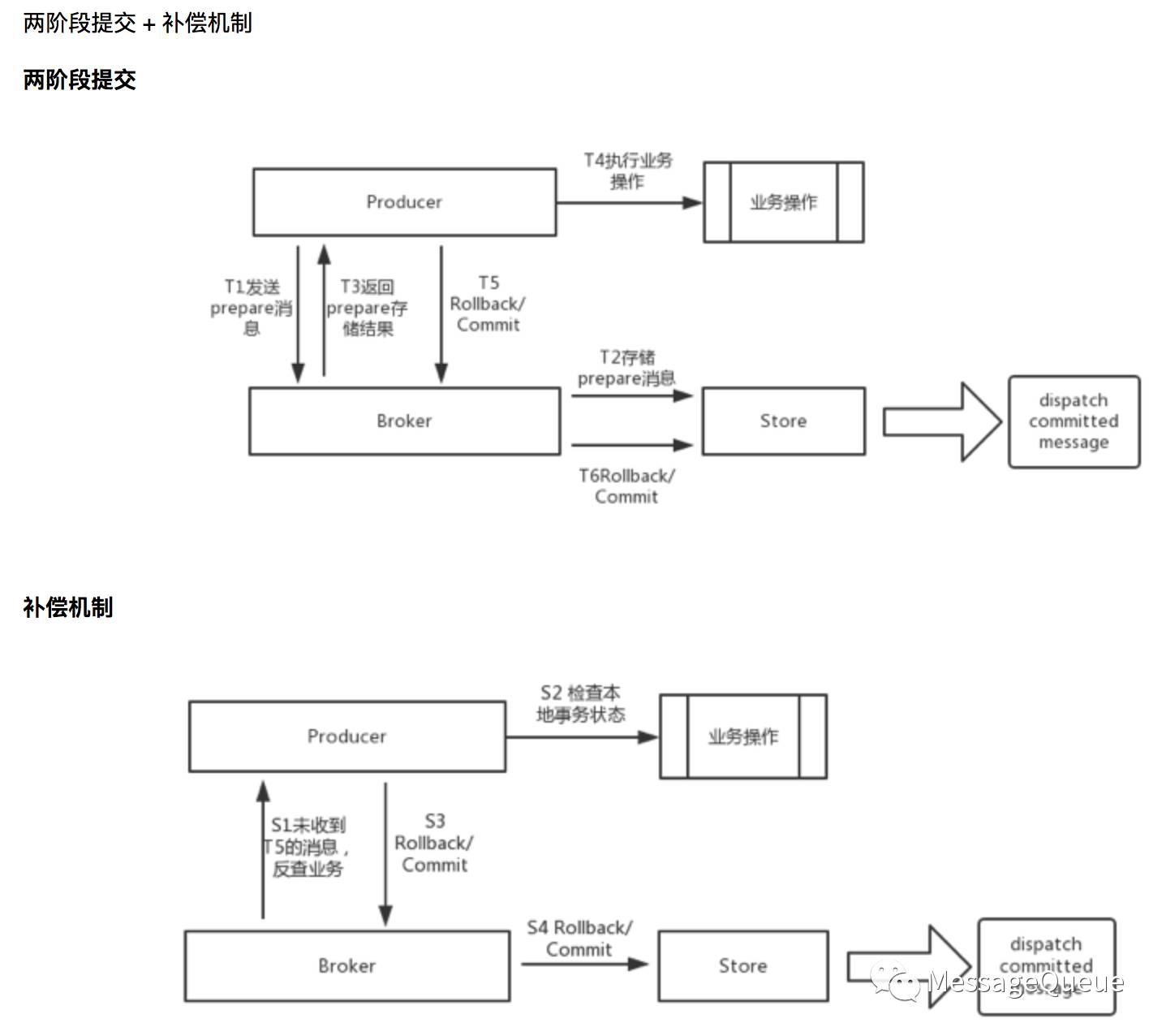 上图是之前我们考虑实现事务消息时的一个思路,通过两阶段提交和补偿机制来实现: