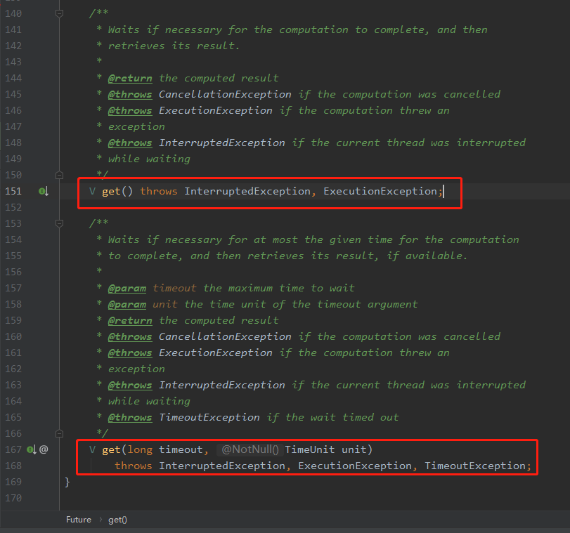 调用 Future 的 get 方法,有不带超时时间的无限等待的舔狗类型的 get,也有带超时时间、到点就放弃的渣男类型的 get:
