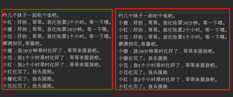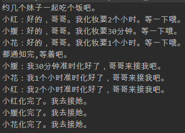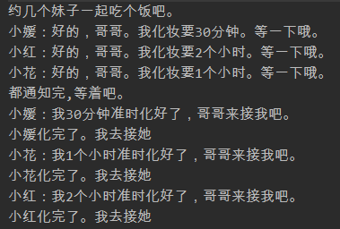 System.out.println("小媛:好的,哥哥。我化妆要30分钟。等一下哦。");