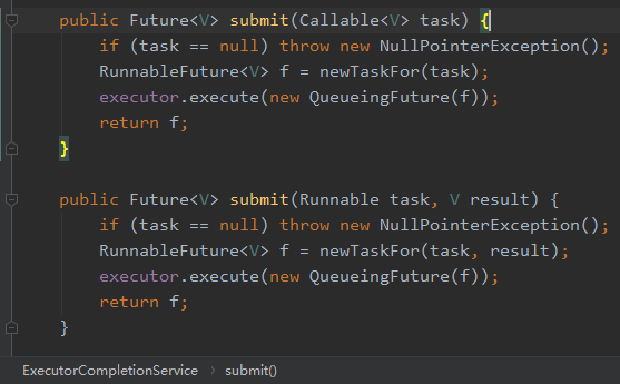 由于用 ExecutorCompletionService 主要是为了优雅的处理返回值。所以它支持两种 submit 类型的提交,都是有返回值的。