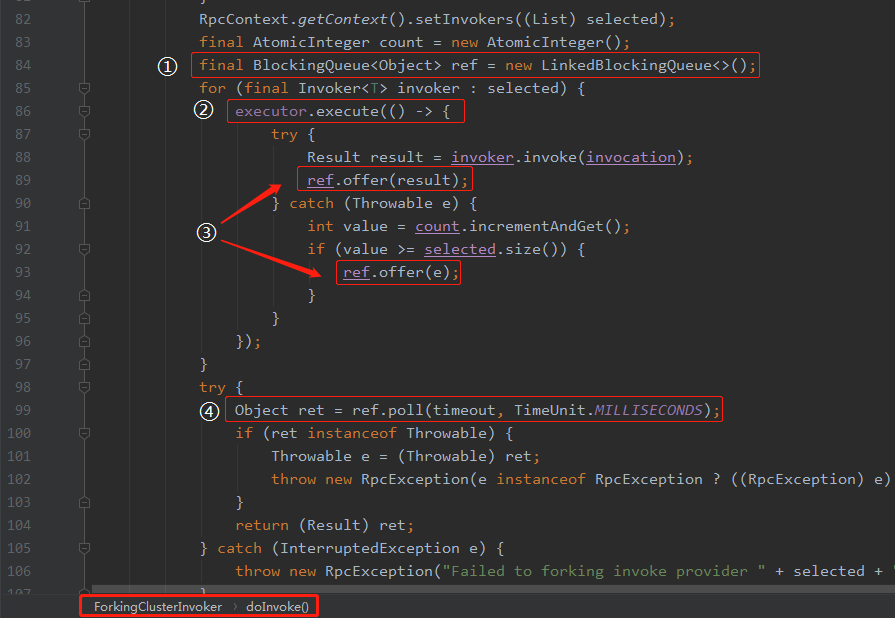 标号为 ② 的地方在循环体中提交异步任务。需要几个服务提供者就有几次循环。