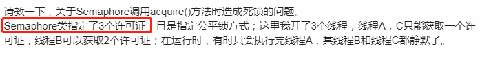 这时又是一个公平锁,所以,如果线程 B 先进去排队了,剩下的许可证不足以让 B 线程运行,它就一直等着。C 线程也就没有机会执行。