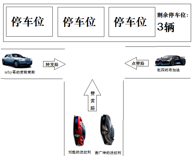 我们还是带入之前停车的场景。假设赵四和我先把车停进去了,这个时候刘能、谢广坤他们来了,发现车位不够了,两个好基友嘛,就等着,非要停在一起: