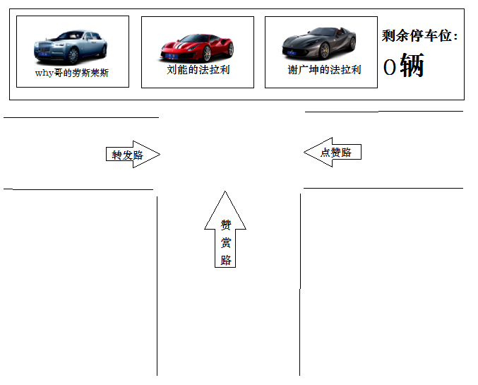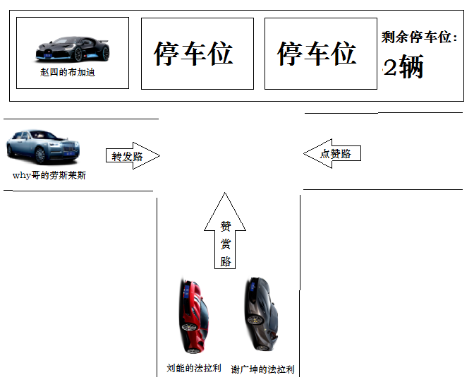 在上面这个场景中就是:赵四的布加迪开进去停车后,后面刘能、谢广坤的法拉利和我的劳斯莱斯都停不进去了。