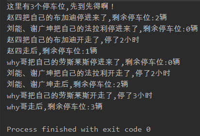 跑起来,结果也正确,所有车都走了后,停车位还是只有 3 辆:
