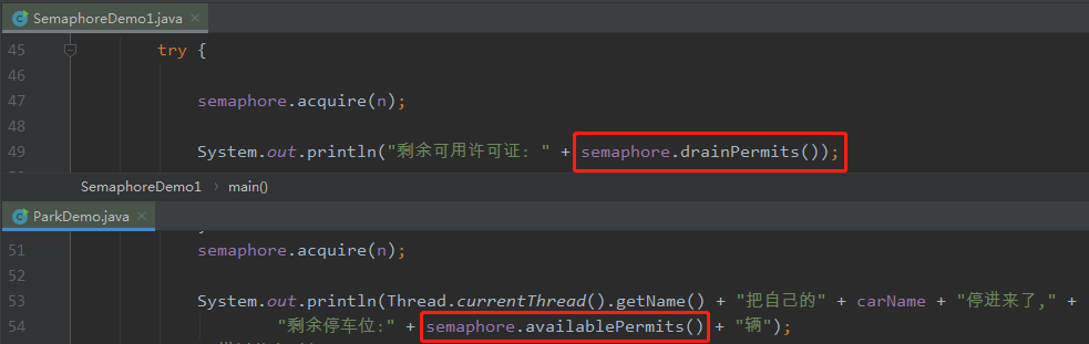 System.out.println(Thread.currentThread().getName() + "把自己的" + carName + "停进来了," + "剩余停车位:" + semaphore.availablePermits() + "辆");