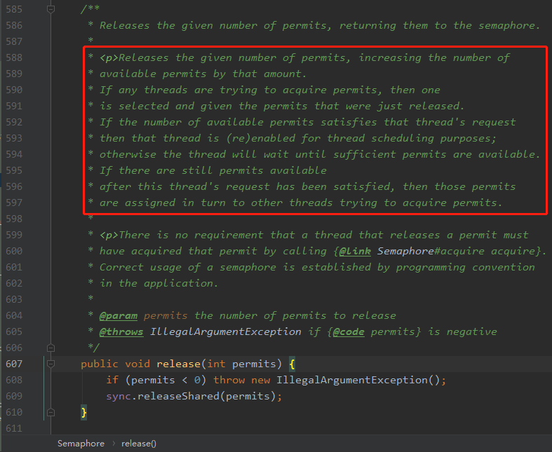 上面红框框起来的部分是它的主要逻辑。大家自己看一下,我就不翻译了,大概意思就是释放许可证之后,其他等着用许可证的线程就可以看一下释放之后的许可证数量是否够用,如果够就可以获取许可证,然后运行了。